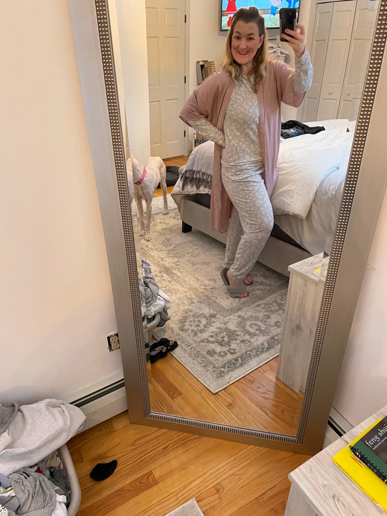 So let’s talk about how I’m changing that…..I am going to post a picture of my outfit today. Because I have realized that when I get up and get ready for work it’s not just the fact that I’m out of the house its the fact that I am dressed, I have makeup on my face, and feel like a human and that makes me feel good about myself. So I thought why not feel good about myself at home? Now, I am the queen of comfortable. I hate wearing tight things even when I have to work or go out. So I got a couple cute lounge outfits that actually match at Marshals and laid one out for my new fresh to death at home morning routine.